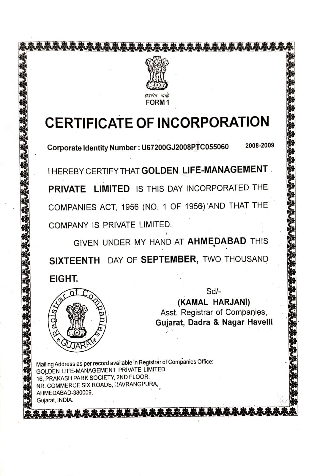 - Golden life management Pvt. Ltd. GLM House New Shreyas Apartment Opp Tagore Park Jain Derasar Nehru Nagar Circle, Ambawadi Ahmedabad 380015 Gujarat INDIA.